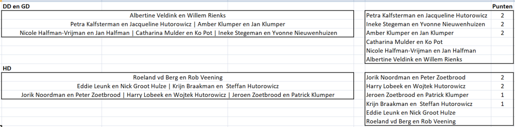 De winnaars van de poules waren: Irene en Eric, Jelke en Erwin en Simone en Bert. Na de kruisfinales bleken Simone en Bert de sterkste vandaag. Gefeliciteerd!